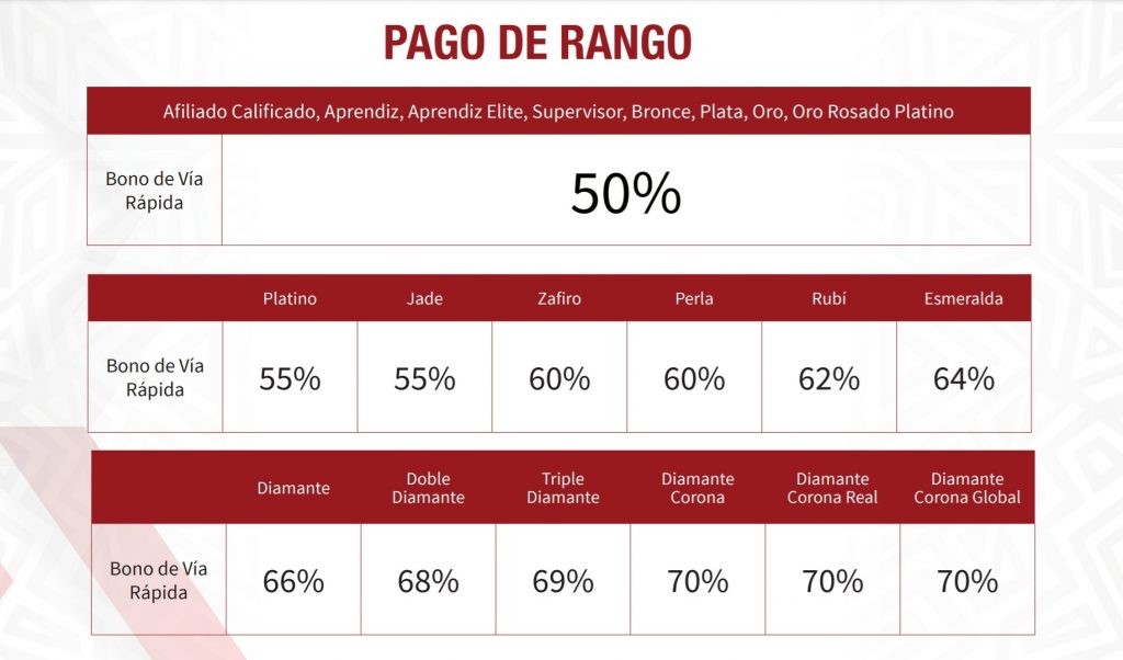 Por ejemplo: Si cierras el mes de enero como rango Ruby, tu bono de Inicio Rápido será pagado al 62% cada vez que afilies a alguien con un paquete de inicio.